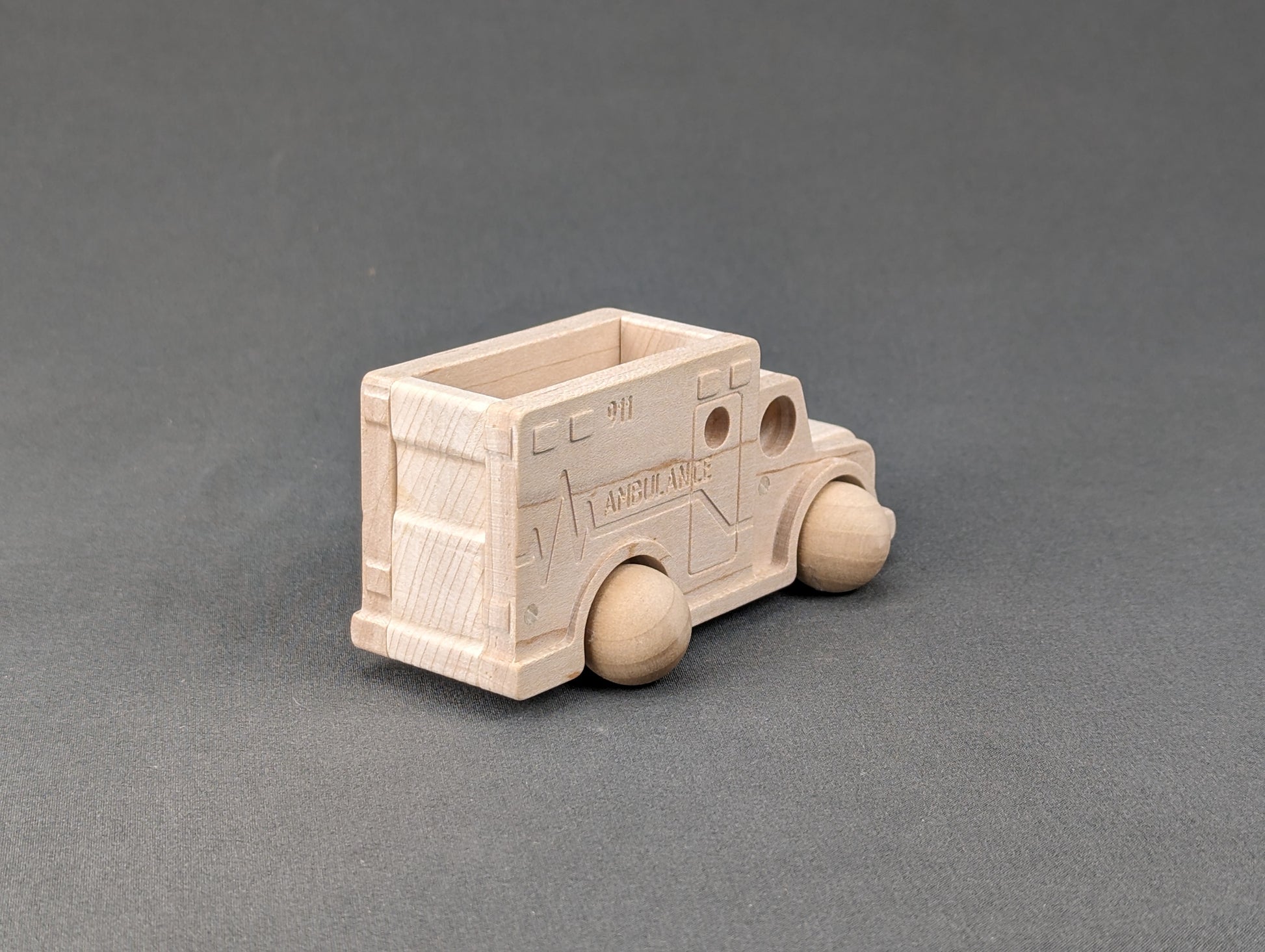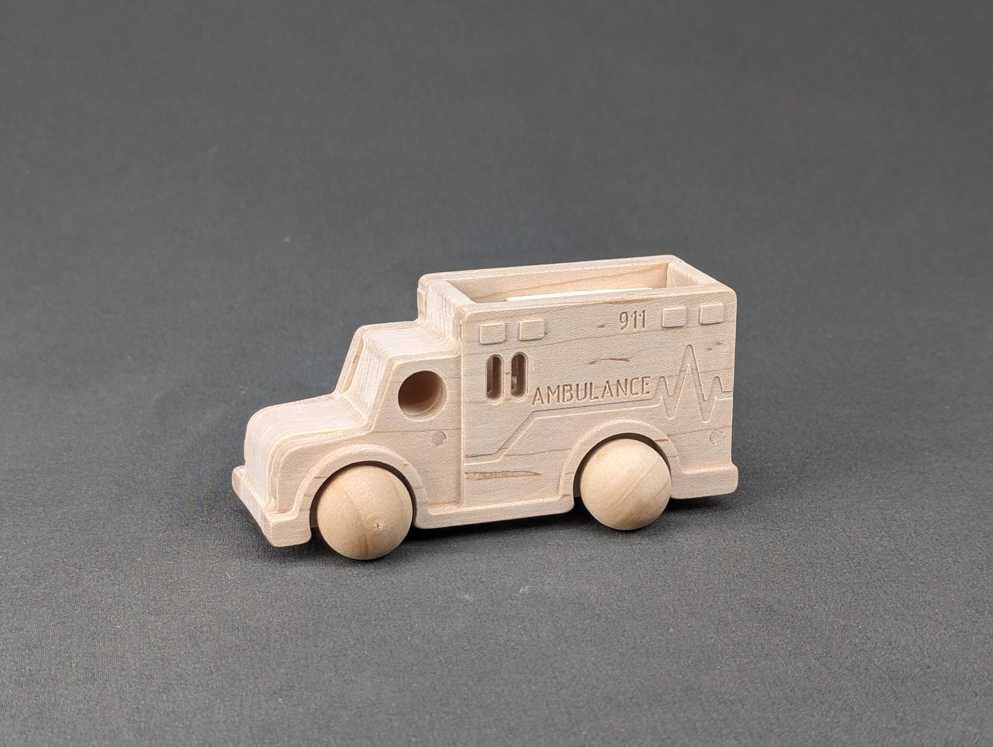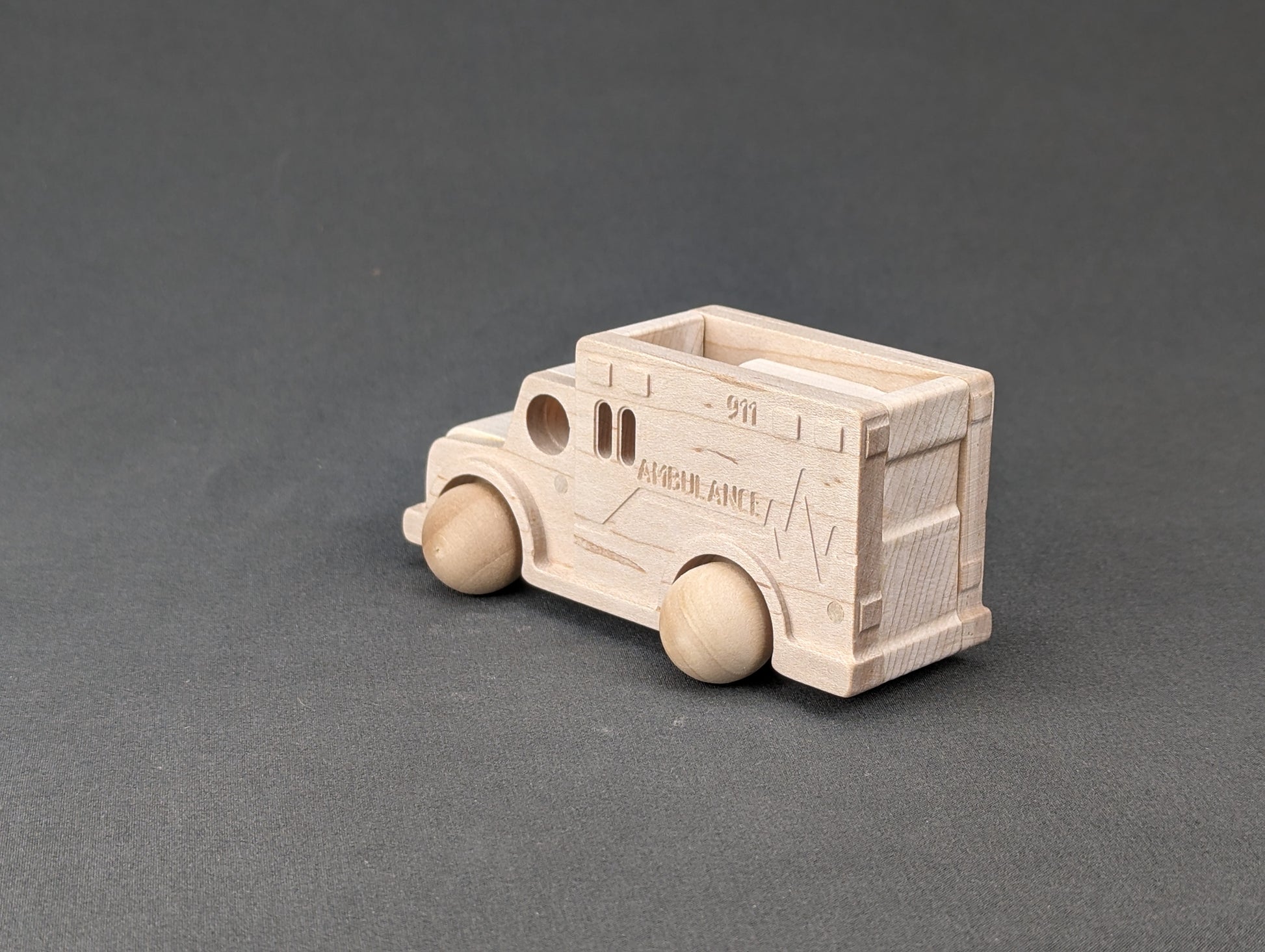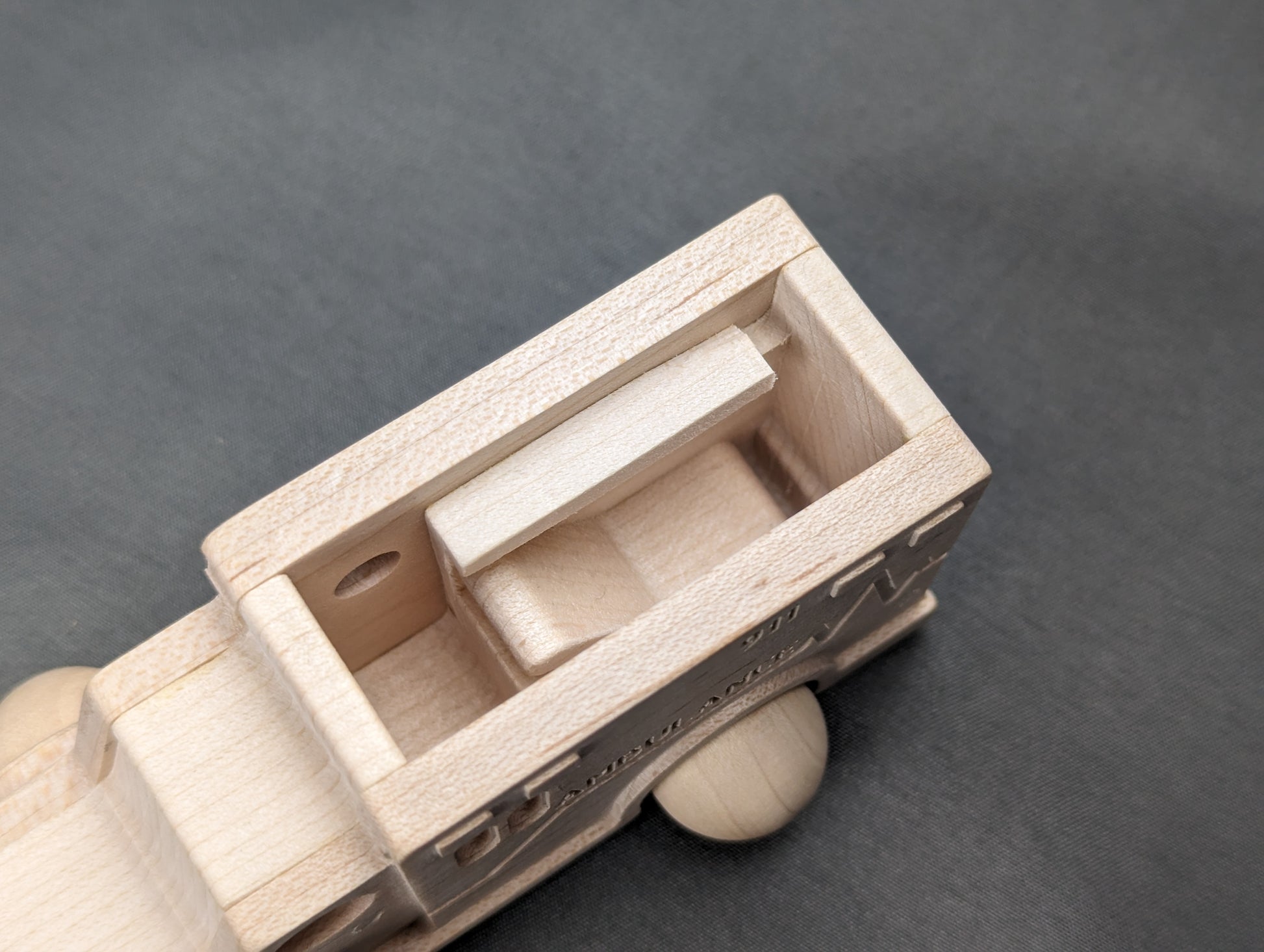 The highly detailed, yet very sturdy construction, smoothly sanded surfaces all around and the typical Mini Roller hardwood ball wheels, make it a joy to drive this ambulance all day long. At just under 2 ounces it won't weigh you down either. The interior of the patient area is detailed with a stretcher for (imaginary or veeery small) patients and wall cabinets for (imaginary) bandages.