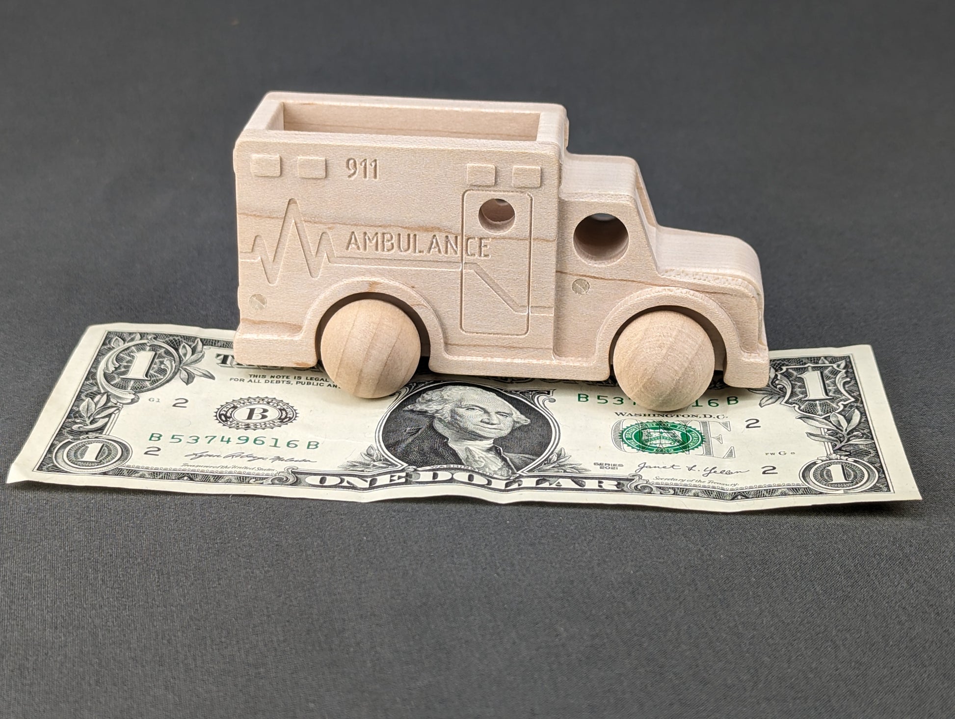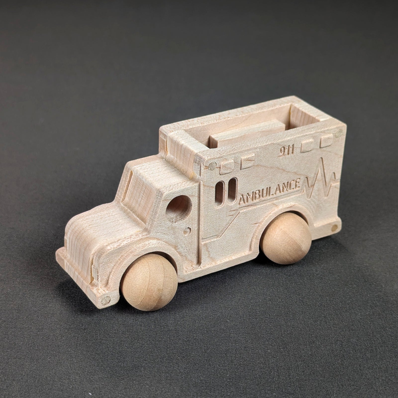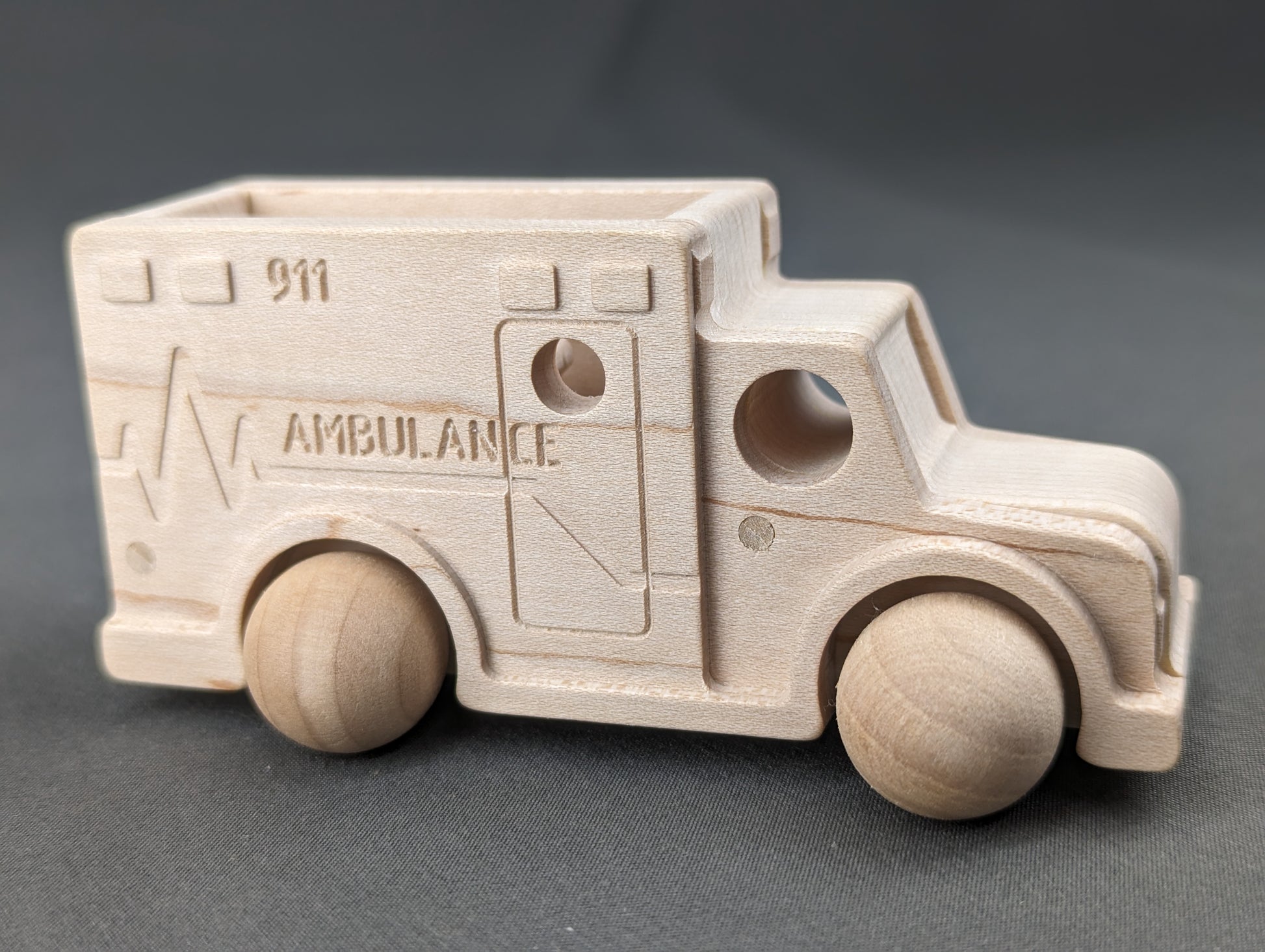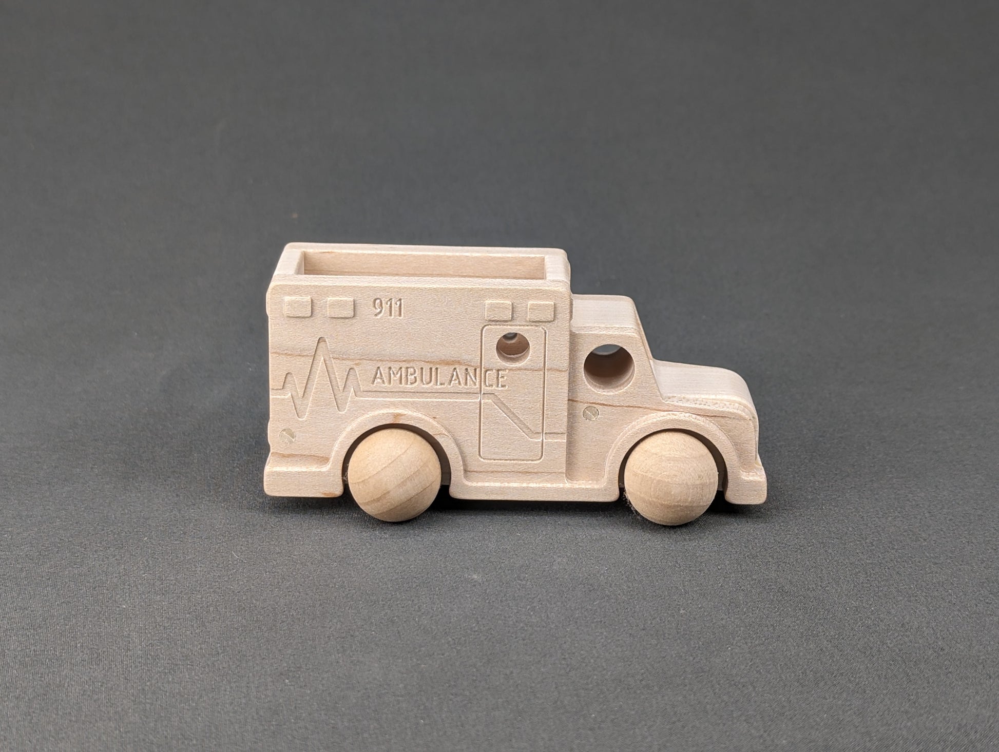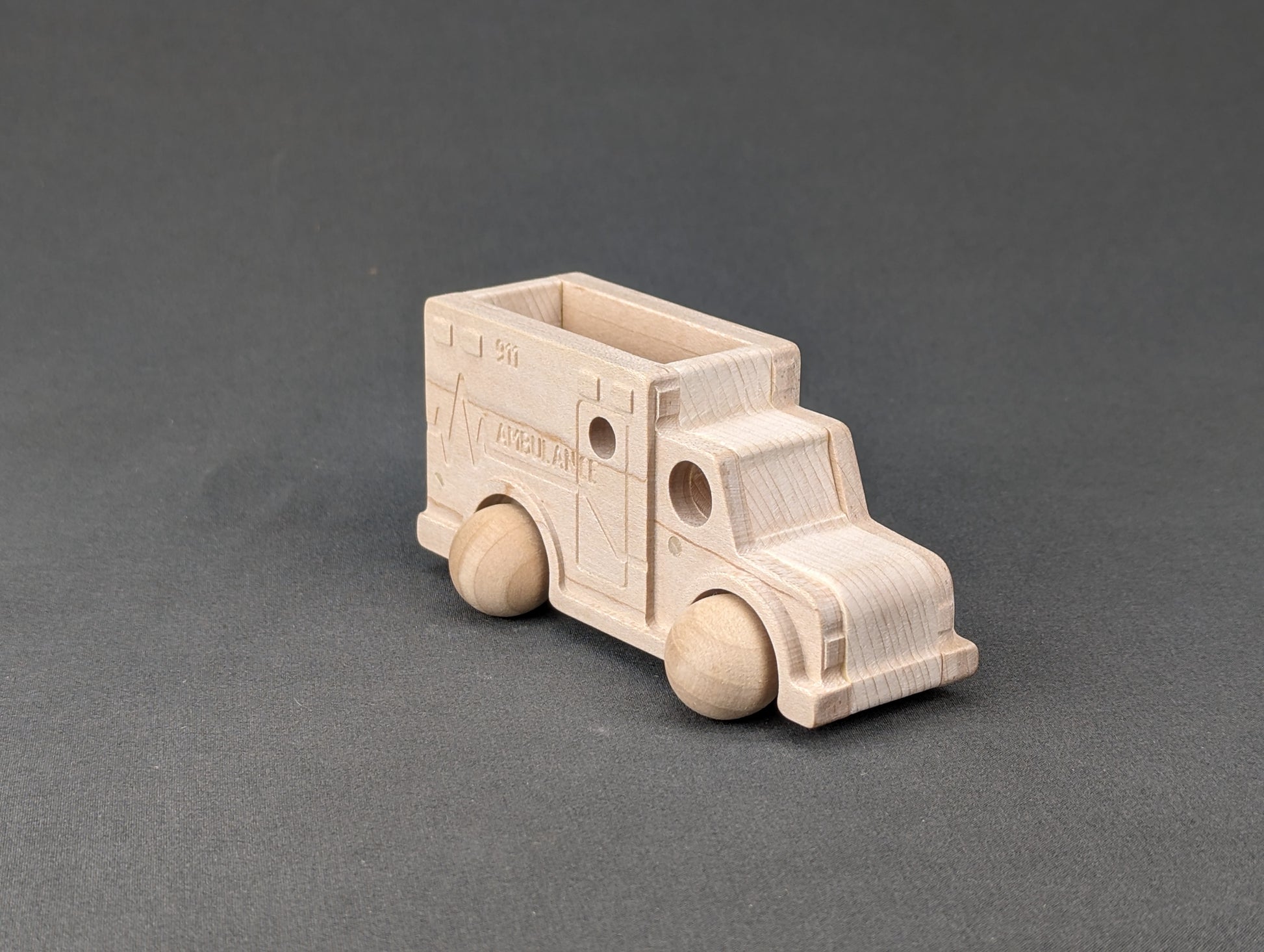 The highly detailed, yet very sturdy construction, smoothly sanded surfaces all around and the typical Mini Roller hardwood ball wheels, make it a joy to drive this ambulance all day long. At just under 2 ounces it won't weigh you down either. The interior of the patient area is detailed with a stretcher for (imaginary or veeery small) patients and wall cabinets for (imaginary) bandages.
